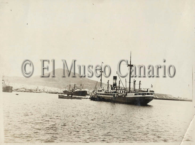 Se observa en plano medio, un buque en cuyo casco se puede leer la inscripción: "INCD / BREMEN". Junto a él se aprecian unas barcas y una lancha. Al fondo de la imagen se distinguen otras embarcaciones atracadas en el puerto y uno de los conos volcánicos de la península de La Isleta.
