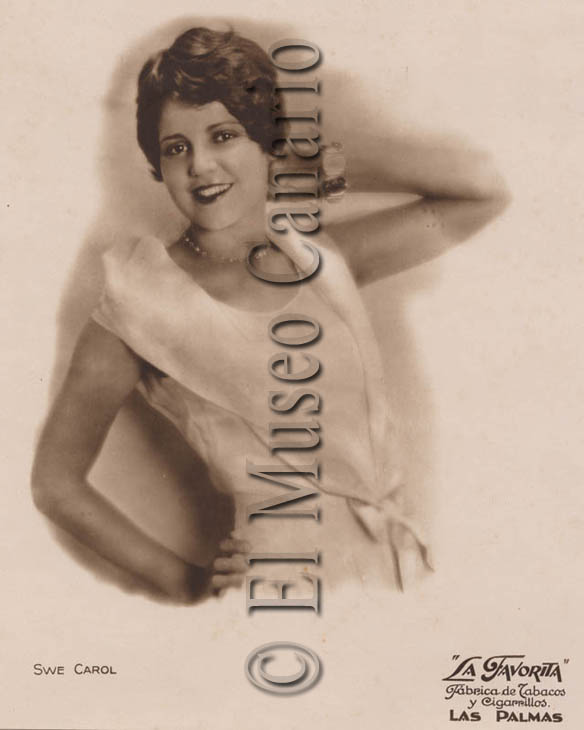 En el borde inferior de la imagen aparecen dos inscripciones impresas a tinta de color marrón. Cerca de la esquina izquierda se puede leer. "SWE CAROL". Y en la esquina derecha, "LA FAVORITA" / Fábrica de Tabacos / y cigarrillos. / LAS PALMAS".