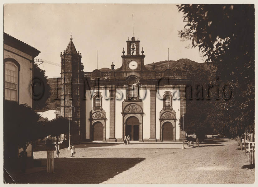 Descripción: Plano general tomado a pie de calle dirigido hacia el frontal de la basílica de Teror. Se aprecia la disposición de la plaza frente a la misma y varios hombres, mujeres y niños.