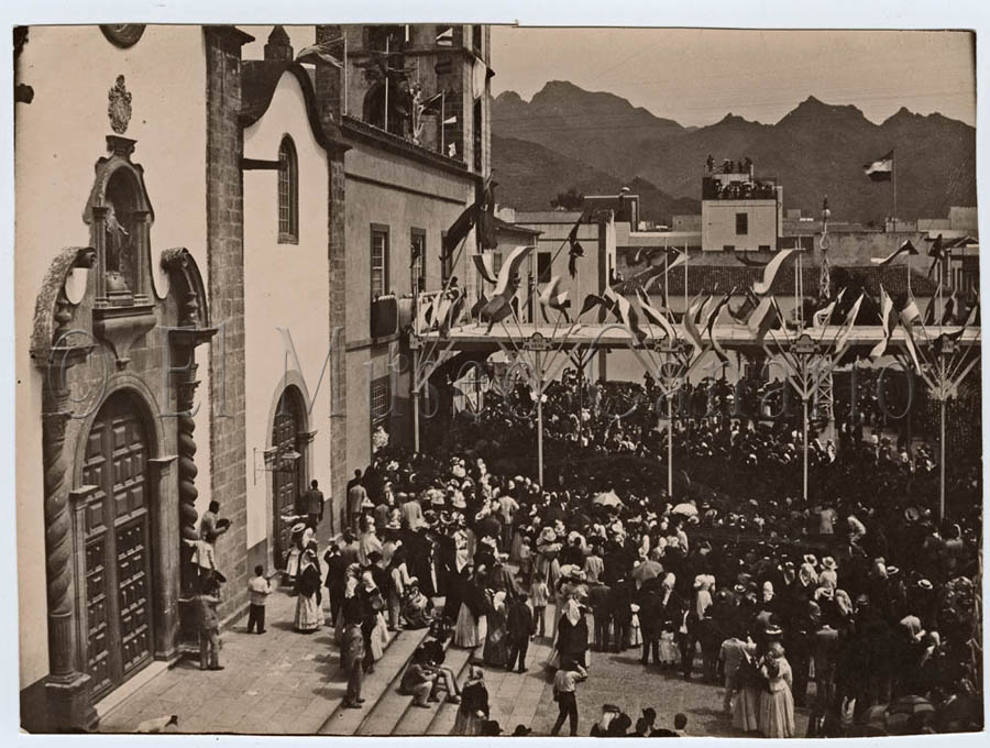 Descripción: Vista general de una procesión ante la iglesia de San Francisco de Asís en Santa Cruz de Tenerife. La fotografía está tomada desde lo alto de un edificio contiguo.