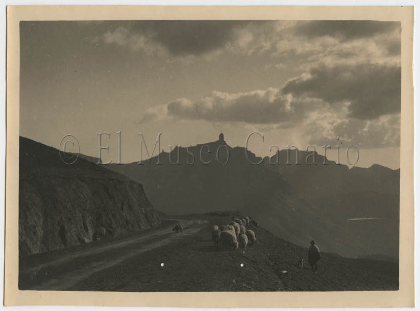 Descripción: Vista general del macizo del roque Nublo en la que destacan, en fondo de la imagen, el perfil del mismo y el roque del Fraile. En primer plano aparece un rebaño de ovejas, con su pastor y un perro, que caminan al borde de una carretera. En la fotografía se aprecia un paisaje desprovisto de vegetación arbórea, ya que todavía no habían comenzado las repoblaciones de pinar en la cumbre de Gran Canaria.