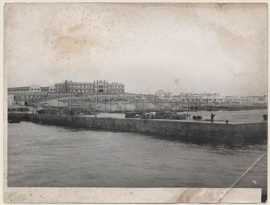 Descripción: Plano general de un muelle no identificado en el que aparecen numerosos sacos apilados y, al fondo, varios edificios.