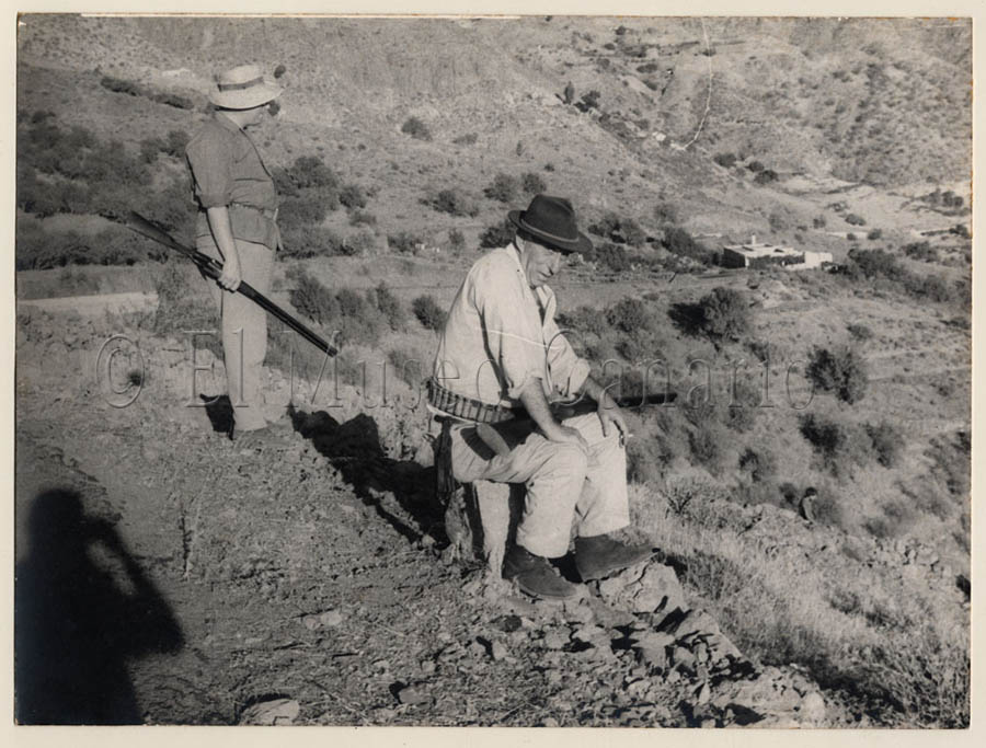 Descripción: Retrato en plano entero y de perfil de dos cazadores de perdices en un bancal abandonado situado en la ladera de un barranco. En segundo plano y en el borde derecho de la imagen se distingue a un niño bajando la ladera. Al fondo de la imagen se divisar numerosos árboles frutales y algunas construcciones.