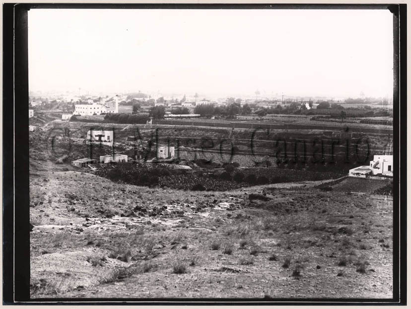 Descripción: Vista panorámica de la Vega de Telde en la que se observa, cerca del borde izquierdo, la fábrica azucarera de San Juan. A ambos lados de la fábrica se distinguen las iglesias de San Juan y de San Francisco de Telde.