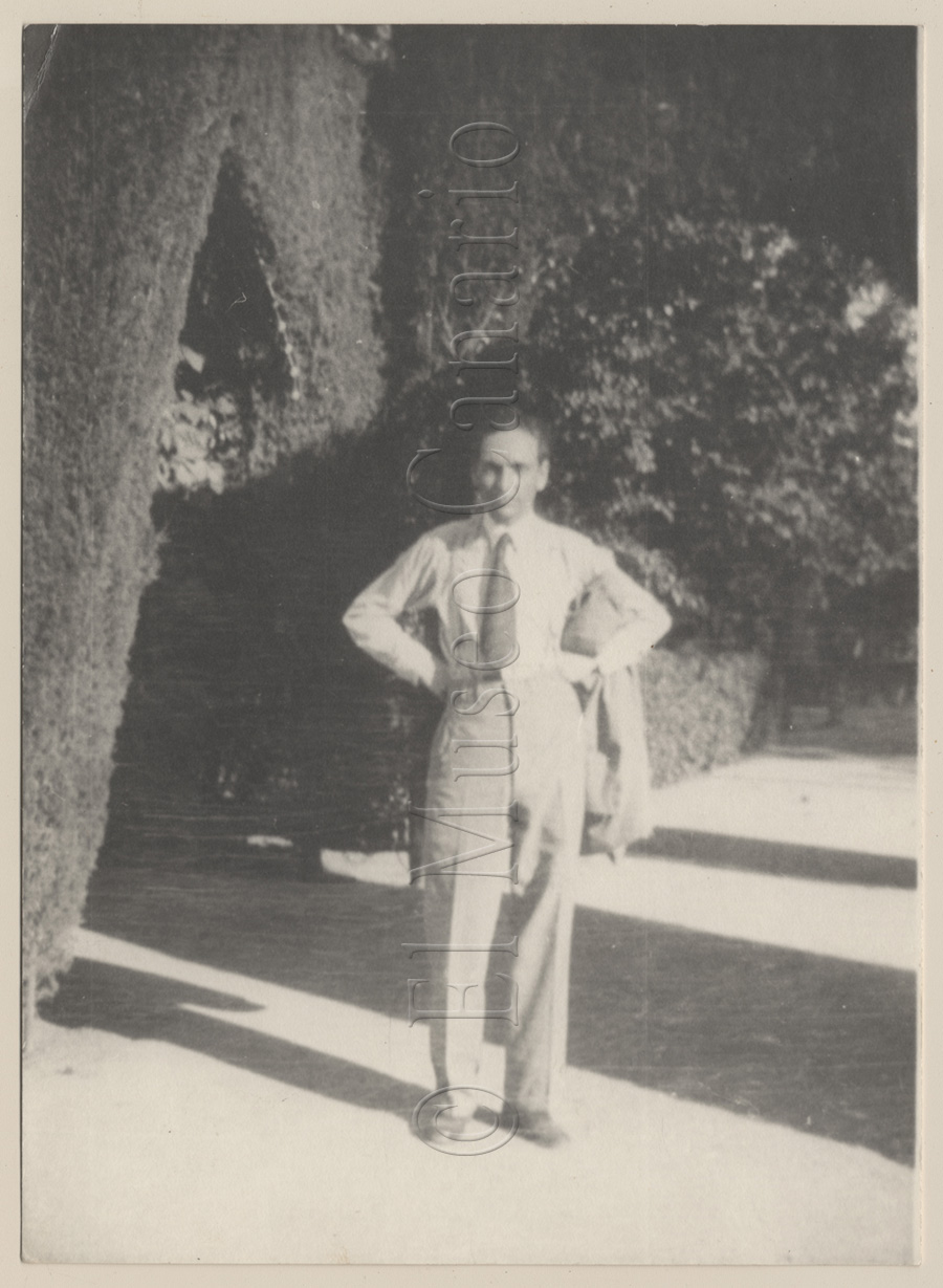 Alcance y contenido: Personaje masculino sin identificar. Retrato realizado en un parque.Documento asociado