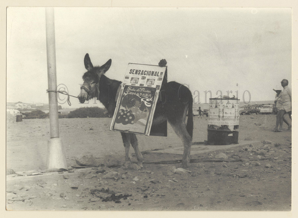 Alcance y contenido: Burro atado a una farola. Sobre el lomo figura el anuncio de la Sala de Fiestas Tamadaba (Las Palmas de Gran Canaria)Documento asociado