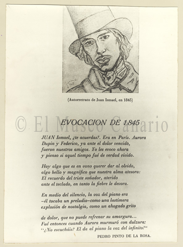 Alcance y contenido: Reproducción fotográfica del soneto escrito por Pedro Pinto de la Rosa titulado "Evocación de 1845" ilustrado con el autorretrato de Juan Ismael en 1845.Documento asociado