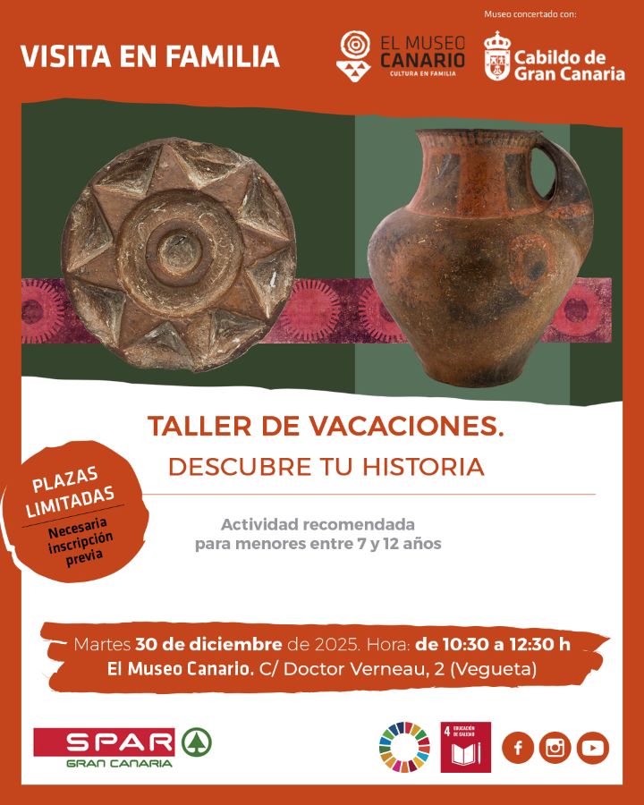 El 30 de diciembre, El Museo Canario concluye su programa de Visitas en Familia 2025, desarrollado con la colaboración de SPAR Gran Canaria, con un taller para menores de entre 7 y 12 años que llevará por título «Taller de vacaciones. Descubre tu historia». La propuesta, de carácter práctico, contempla un conjunto de actividades para dar a conocer las formas de vida de la población aborigen de Gran Canaria, profundizando en algunos aspectos de su cultura. En esta ocasión se realizará un acercamiento a los motivos decorativos que muestran las pintaderas y otros objetos.